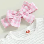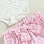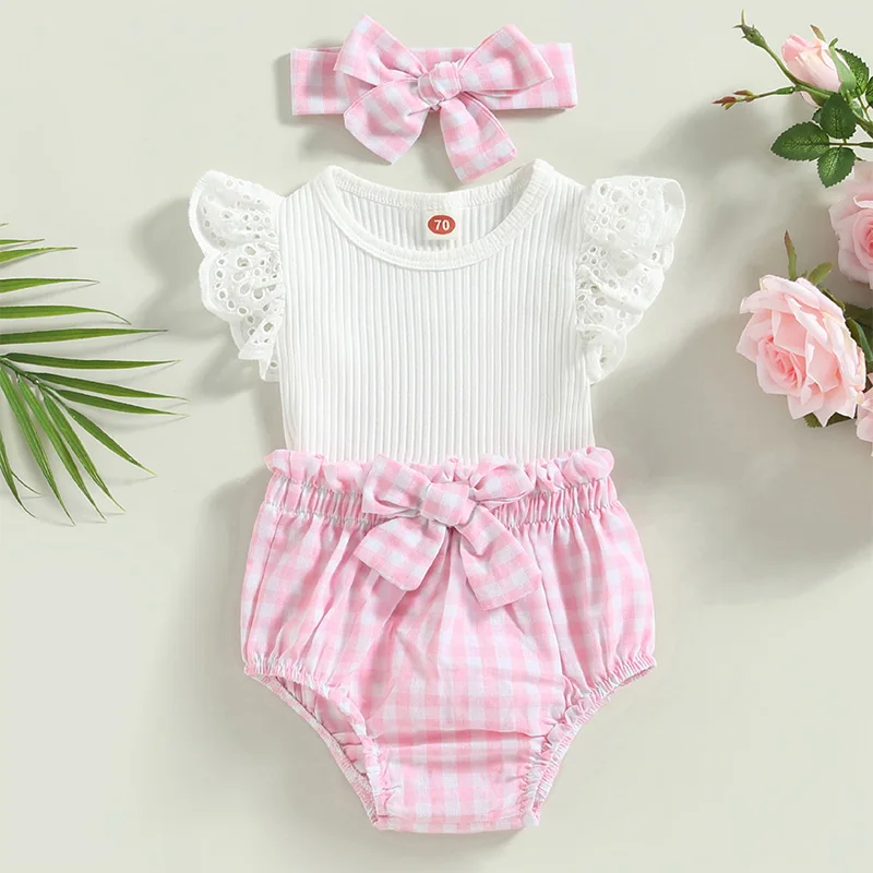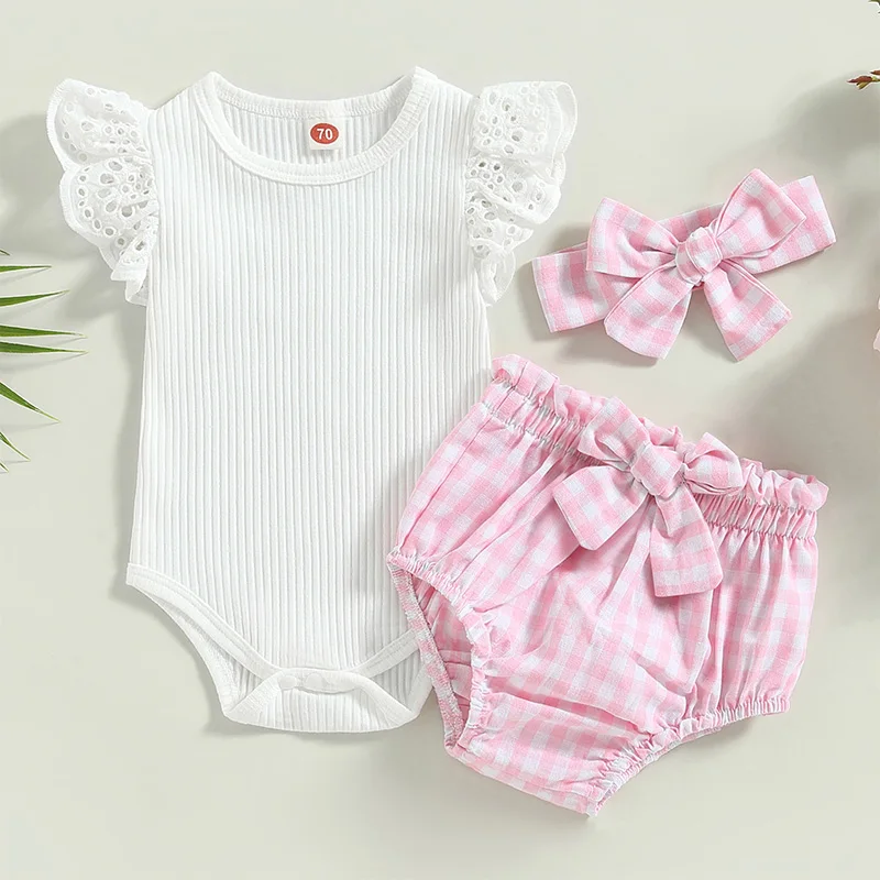 Dress her in sweet charm with this Baby Girl Plaid Outfit — a 3-piece set featuring a flutter-sleeve romper, stylish plaid shorts with an elastic waist, and a matching bow headband. Perfect for picture days, playdates, or warm-weather outings with a fashionable flair.